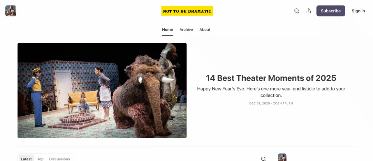 Zoe also shares theater thoughts and recommendations in a bi-monthly newsletter, Not to Be Dramatic, and on TikTok.